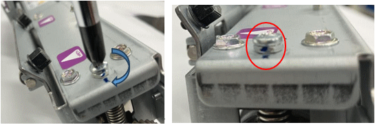 在图像上,它会表现为光泽不均匀。原因 纸张的边缘损坏了定影带,从那里损坏逐渐扩大并损坏了带的表面。行动 降低压印线压力。对于所有介质,使用纸张目录,将详细设置 #1246-01 中的定影压印线降低至 1。对于要添加的任何介质,也将详细设置 #1246-01 中的定影压区减少为 1。 松开前面的螺丝并移动螺母,使螺母接触螺丝头。