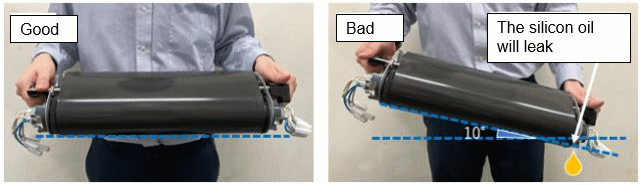 <程序>将定影带放置在平面上时,定影带内部涂抹的硅油的数量和量会有所不同;因此,请参考下表。将定影带放置在平整表面上时,将定影带放在干净的纸张上,并确保“张紧辊”在上方,“润滑辊”在下方,以避免漏油。