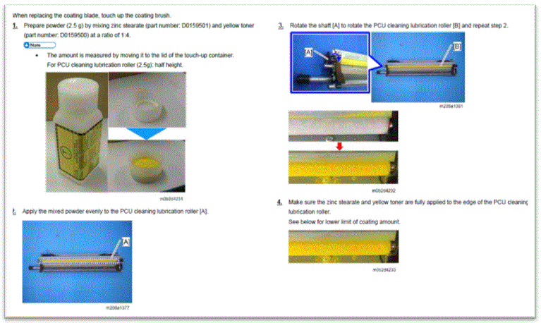 在你开始之前: 此操作需要更改一系列 SP 设置,最好准备调试电缆和 Tera Term 应用程序。有关详细信息,请参阅本公告最后一页的附录。对于滚筒清洁单元,预计哪个站使用覆盖率 20% 或以上: 将润滑剂刀片更换为 9200/9210 中使用的刀片。(M0EDJ110 -> M0B13652)