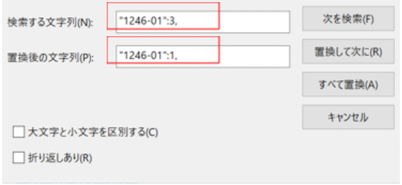 单击“编辑”并选择“替换”。 输入以下字母。查找内容:“1246-01”:3 ,替换为:1246-01":1 ,