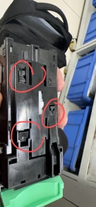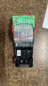6.旧钉盒没问题,将新钉盒的钉子装到旧钉盒上测试。 7.发现故障消失,打印正常,立即检查新钉盒内部,发现新钉盒内部出现严重卡钉,造成阻碍上不去钉。 8.取出新钉盒卡钉后将钉子重新安装到新钉盒中测试正常。 注意事项: 取钉方法: 1.拨动图中标记三个位置,抬起钉子后部。