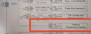症状: 反馈一台IM C2000彩机提示“ITB单元设置错误”及“请正确设置纸张转印单元”, 维修过程: 1、检查ITB 组件及纸张转印辊组件未见异常,重新安装后故障依旧; 2、更换ITB 组件及纸张转印辊组件(正常机器拆卸),故障依旧; 3、询问现场工程师设备是在什么情况下发生的该故障或之前有何种作业?工程师反馈之前有更换黑色色粉贮斗作业,更换后出的相关提示。由此分析大概率为更换作业中线束连接出现问题。 4、反复黑色贮斗更换作业,过程中重点检查周围线束的连接情况,最终发现下图中的线束连接可能存在问题----两个终端设备相互连接,经确认这两个线束连接的终端设备分别为:“鼓温度传感器”和“新ITB 单元检测触点”