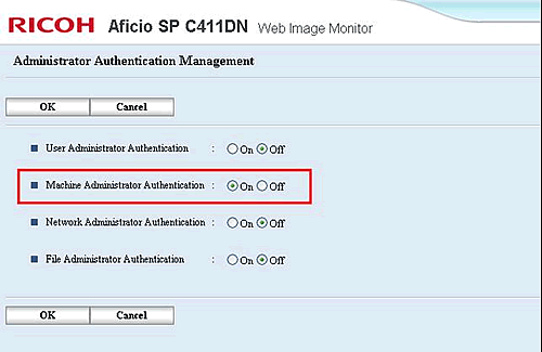 登陆 Web Image Monitor. 配置 > 设备设置 > 管理员认证管理 > 机器管理员认证 > On