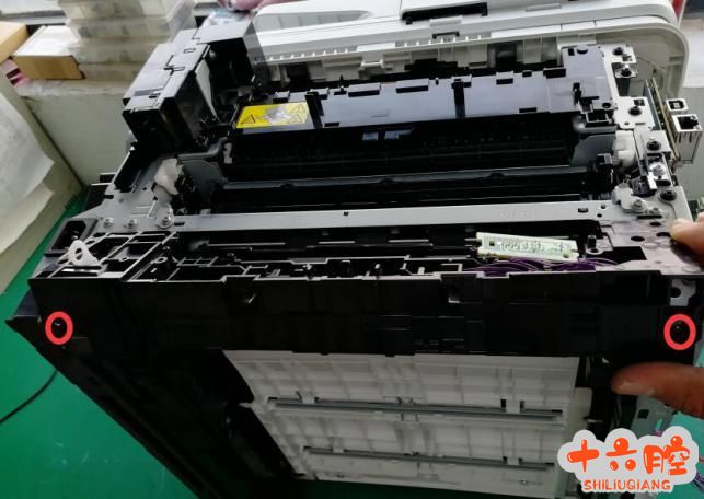 2. 下进纸组件两个螺丝,去掉传感器连接高压板线头(线头拔掉可以省掉取出主板及下面铁架) 取下进纸组件