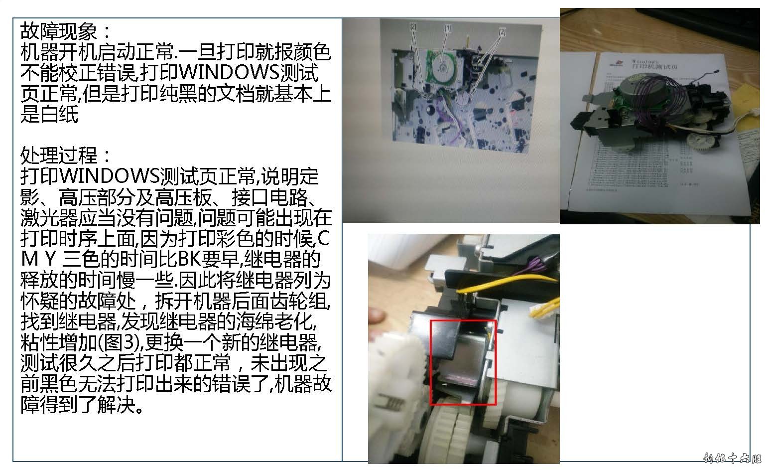 故障现象: 机器开机启动正常.一旦打印就报颜色不能校正错误,打印WINDOWS测试页正常,但是打印纯黑的文档就基本上是白纸 处理过程: 打印WINDOWS测试页正常,说明定影、高压部分及高压板、接口电路、激光器应当没有问题,问题可能出现在打印时序上面,因为打印彩色的时候,C M Y 三色的时间比BK要早,继电器的释放的时间慢一些.因此将继电器列为怀疑的故障处,拆开机器后面齿轮组,找到继电器,发现继电器的海绵老化,粘性增加(图3),更换一个新的继电器,测试很久之后打印都正常,未出现之前黑色无法打印出来的错误了,机器故障得到了解决。