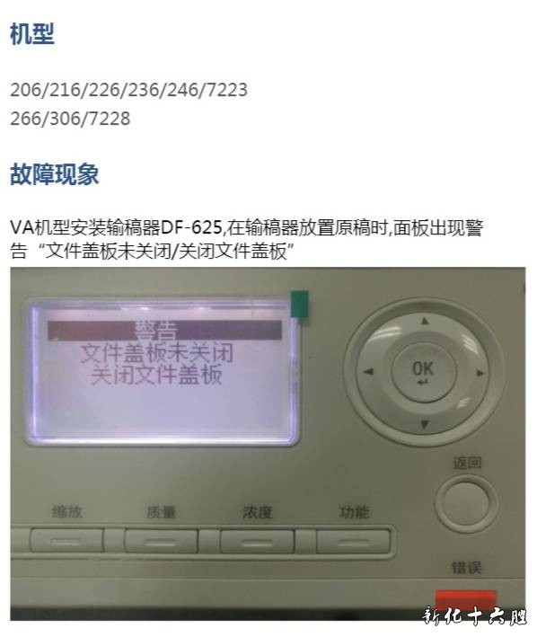 机型 206/216/226/236/246/7223 266/306/7228 故障现象 VA机型安装输稿器DF-625,在输稿器放置原稿时,面板出现警告“文件盖板未关闭/关闭文件盖板”