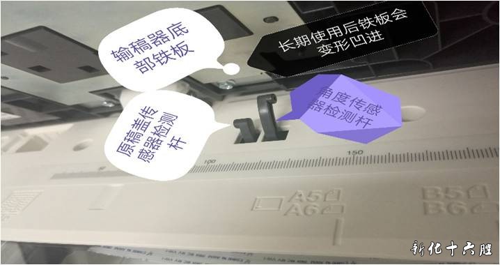 <原因分析> 如下图:长期使用后,传感器检测杆对应的DF-625底部铁板,出现变形弯曲(凹陷), 输稿器盖下后,角度传感器检测杆(长杆)已经遮挡角度传感器,但原稿盖传感器检测杆(短杆)不能完全压下,没有遮挡到原稿盖板传感器,显示屏就会提示文件盖板未关闭。