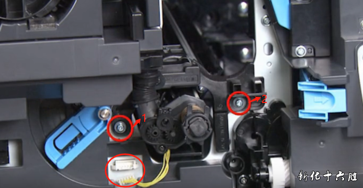 柯美287、367更换显影仓过程,先取下套鼓,下面介绍显影仓更换方法: 一、先取下套鼓,如何取下套鼓请照《柯美287、367更换套鼓图解》; 二、取下显影仓的连接线螺丝,如下图: