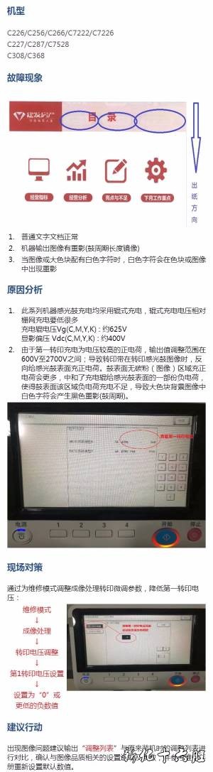 柯美复印机图像有鼓周期重影 访客 2018年12月18日 21:48 2 0 C226/C256/C266/C7222/C7226 C227/C287/C7528 C308/C368 第一转印电压偏高导致机器输出图像有重影故障解决方案。 上一篇柯美复印机A4纸张检测成A5 下一篇bizhub 654 大量打印图像移位并变浅故障 相关文章 柯美C14000,C7100,C4080快速阅读指南 维修案例,理光复印机维修... 维修案例 访客 5 2025-04-11 三星MX3050,3060,3070,3550如何初始化管理员密码和服务密码 本说明介绍了如何初始化管理员密码和服务密码MX3050/3060/3070/3550/3560/3570/4050/4060/4070N 系列默认。请注意,一旦... 维修案例 访客 4 2024-12-02 惠普Laser NS MFP 1005/NS 1020打印内容间歇性上移的问题 问题描述:– 用户的NS MFP1005/NS 1020使用一段时间后,连续打印的时候,会出现打印内容间歇性上移的问题,如下图所示问题原因:– 使用一段时间后,... 维修案例 访客 4 2024-11-03 惠普鼓粉分离的消费黑白激光打印机59.C0错误或开机自检齿轮组有巨大噪声 涉及型号:M104/M132/M203/M227系列故障现象:– 开机自检时右侧齿轮组有非常大的连续的齿轮打齿的声音,随后面板提示59.C0或就绪+警告灯常亮故... 维修案例 访客 4 2024-11-03 关于惠普M128FP加热组件卡纸,打印变形拉长解决方法 故障:HP Laserjet Pro MFP m128FP 打印卡纸,纸张卡在加热组件里,打印的字体和图案有拉伸拉长变形故障分析:1. 工程师对机器行了简单的测... 维修案例 访客 4 2024-11-03 惠普M1005打印机不停进纸快速解决方案 适合产品:M1005,M1020故障描述:打印机不停进纸客户送修一台M1005打印机开机不停进纸情况,一般出现此情况大多都是跟继电器(离合器)有关。如图1:红色... 维修案例 访客 4 2024-11-03 惠普CP1025 无法连接WLAN 无法安装无线网络 故障现象:CP1025NW无法安装WIFI打印机故障分析:客户反映机器一直无法安装无线打印功能。每次都提示输入密码。之前并没有设置密码。上门检测首先用USB线连... 维修案例 访客 4 2024-11-02 惠普激光打印机(尤其是多功能一体机)出纸口有水汽凝结的说明 惠普激光打印机(尤其是多功能一体机)出纸口有水汽凝结的说明[*]水汽和打印机无关,打印机自身不会产生水蒸气[*]水汽是因为打印的纸张潮湿,在加热过程中被蒸发出来... 维修案例 访客 4 2024-11-02 留言评论取消回复