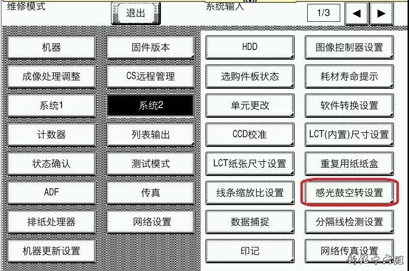 今天在打印时发现在【维修模式】--【系统2】里有个叫【感光鼓空转设置】的选项,这个选项在以前的机型上是没有的,大家都不太明白作什么用途的;我就给大家解释一下这个功能设置使用吧。